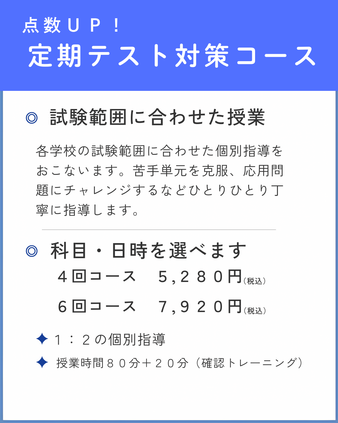 ①学校別の試験範囲に合わせた【5科対策プリント】を差し上げます。②土日に開催の「定期テスト対策勉強会」「英語和訳・暗写勉強会」など各種テスト対策勉強会に無料参加できます。