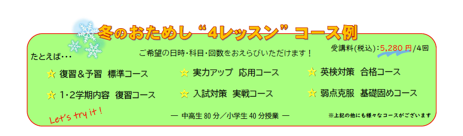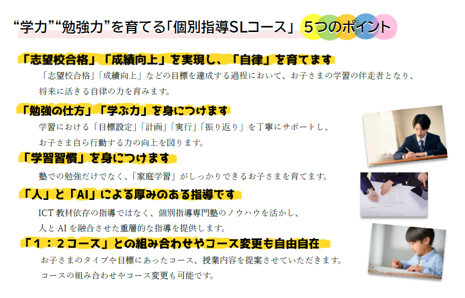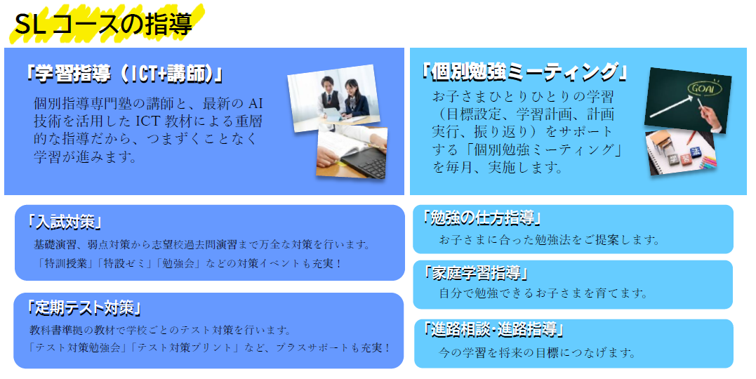 高校受験に向けて自分に合った指導を受けたい、受験対策だけでなく学校の成績も気になる、苦手科目を克服したいなど様々な要望に応えた指導をおこなっています。