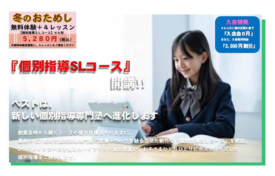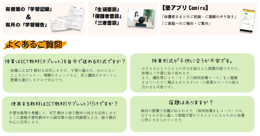 中学受験対策はもちろん、なかなか学習の習慣がつかなくて困っている、学校の進度に合わせて自分のペースで勉強したいなど、生徒さんの要望に合わせたスタイルで学習を進めます。