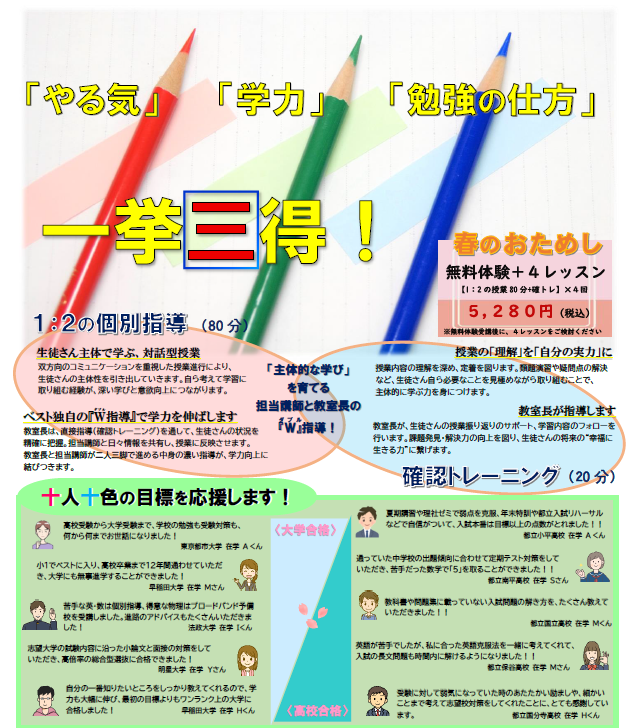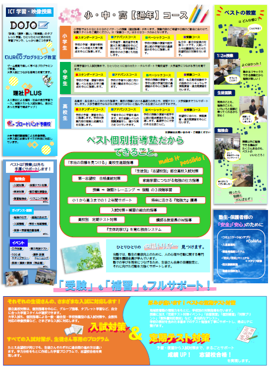高校受験に向けて自分に合った指導を受けたい、受験対策だけでなく学校の成績も気になる、苦手科目を克服したいなど様々な要望に応えた指導をおこなっています。