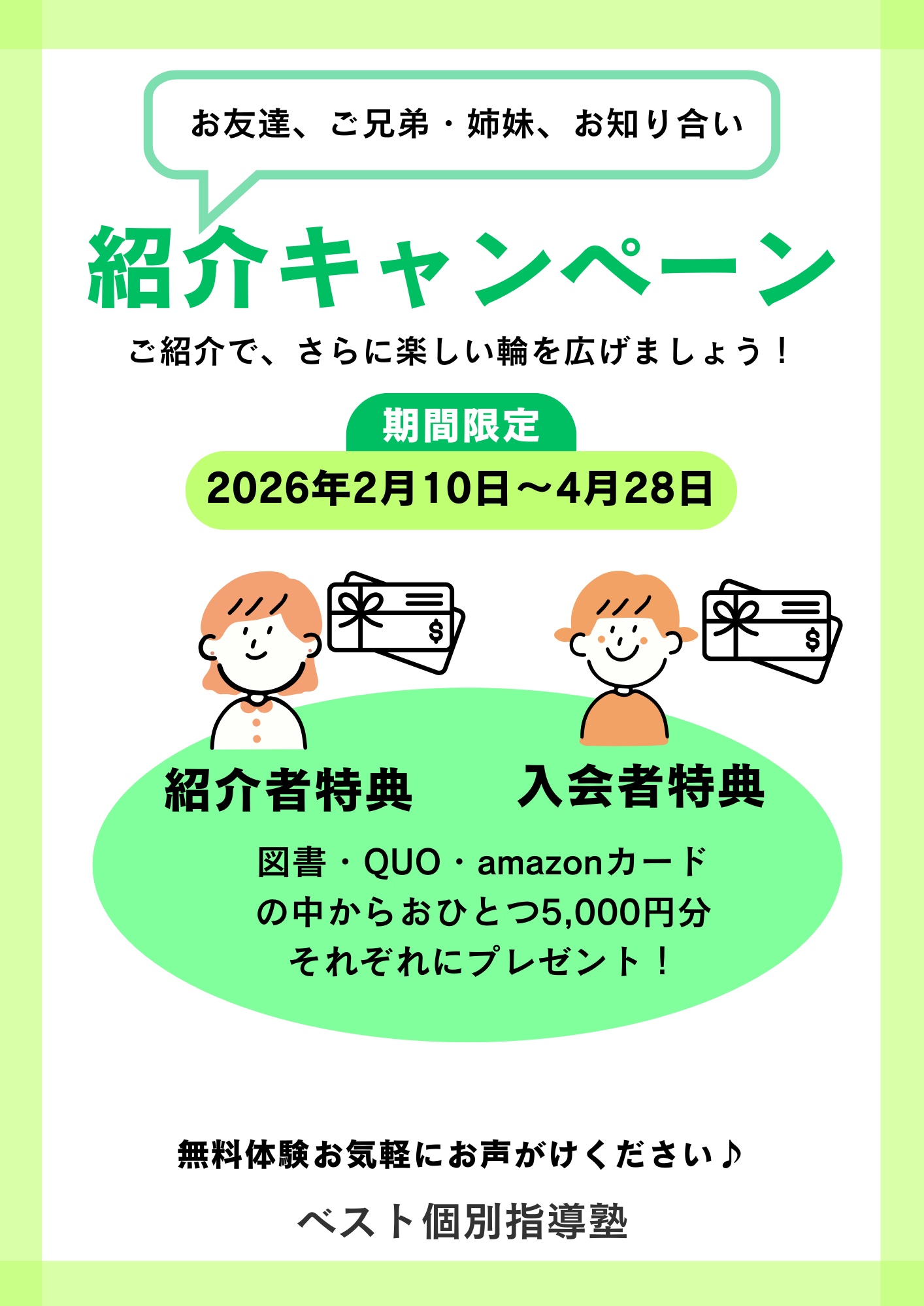 塾生からの紹介をいただくと『冬の特典』をご紹介いただいた方、ご紹介された方ともに進呈いたします。兄弟姉妹やご友人はもちろん、お知り合いの方などで塾をお探しの方がいらっしゃいましたら、ぜひご紹介ください。詳しくは教室までお問い合わせください。