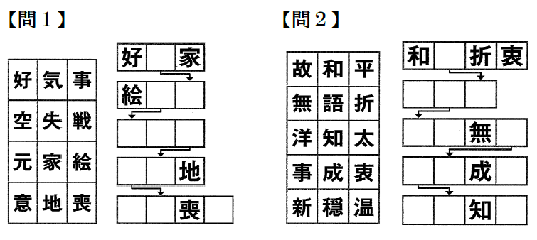 2. 3文字、4文字の熟語が成立するように各問の左の表の漢字を、右のマスの空欄に当てはめてください。矢印でつながる上下のマスには同じ漢字が入ります。