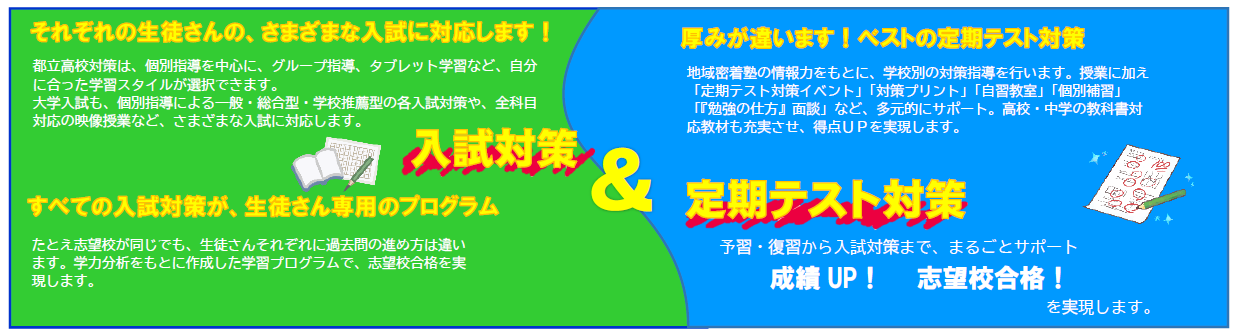 高校受験に向けて自分に合った指導を受けたい、受験対策だけでなく学校の成績も気になる、苦手科目を克服したいなど様々な要望に応えた指導をおこなっています。